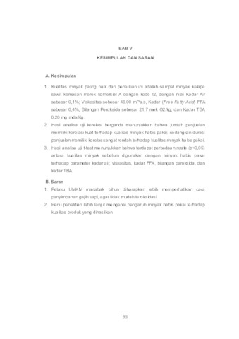 Repeated use of oil is one of the factors that can reduce the quality of consumable oil.quality. This study aims to determine the quality of cooking oil of palm oil and beef gajih before use and consumables from martabak bihun UMKM players in Gresik District, Gresik Regency. This research is a survey research with purposive sampling technique with the amount of cooking oil from 18 actors of UMKM martabak bihun in Gresik District, Gresik Regency. Sampling oil sampling was carried out twice a day, at opening time (08.00 and 16.00 WIB), and at closing time (15.00 and 21.00 WIB). To determine the quality of oil physicochemical testing of oil before use and after use of the UMKM martabak bihun with multiple correlation tests and t-tests at the 5% level. Research results The results showed that the behavior of oil use included sales of more than 25-100 portions/day, and sales duration of 3-10 hours/day, are able to affect the level of quality of consumable oil. affect the quality level of consumable oil. Physicochemical quality of consumable oil that does not meet the standard SNI 7709:2019 with parameters of water content (50%), viscosity (0%), FFA (50%), peroxide number (39%), TBA (44%). While in consumable oil with parameters of water content (78%), viscosity (0%), FFA (89%), peroxide number (100%), TBA (11%). The multiple correlation test results show that the number of sales has a strong correlation with the quality of consumable oil, while the duration of sales has a strong correlation with the quality of consumable oil. quality, while the duration of sales has a very weak correlation to the quality of consumable oil. The results of the t test results show that there is a difference between the oil samples before and after use used by the used and consumables used by martabak bihun UMKM in Gresik District, Gresik Regency.