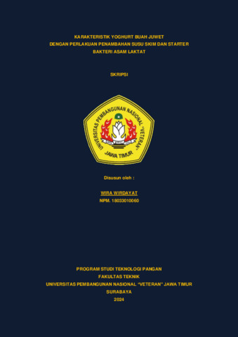 WIRDAYAT, WIRA (2024) Karakteristik Yoghurt Buah Juwet Dengan Perlakuan Penambahan Susu Skim Dan Starter Bakteri Asam Laktat. Undergraduate thesis, UPN Veteran Jawa Timur.