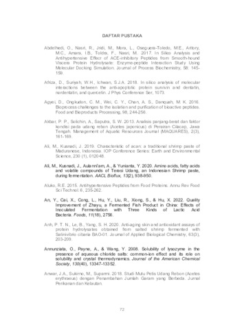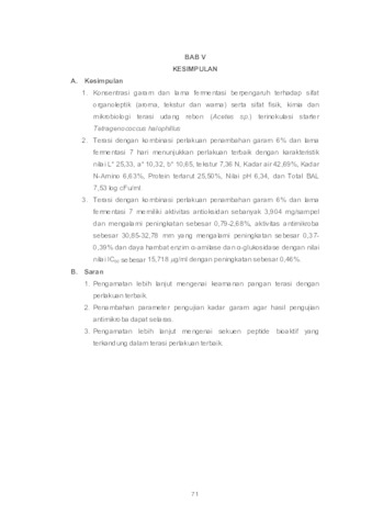 Penelitian ini bertujuan untuk menganalisis potensi pemanfaatan Tetragenococcus halophillus dalam meningkatkan kualitas terasi udang rebon dengan kombinasi perlakuan konsentrasi garam dan lama fermentasi yang berbeda, serta mengidentifikasi potensi aktivitas biologis dari peptida bioaktif yang dihasilkan. Pada penelitian ini dibuat terasi kontrol sebagai pembanding dengan penambahan garam sebanyak 25% dan difermentasi tanpa kultur Tetragenococcus halophillus. Tujuan dari penelitian ini untuk analisis pengaruh konsentrasi garam dan lama fermentasi terhadap sifat organoleptik (aroma, tekstur, dan warna) dan sifat fisik, kimia, mikrobiologi, serta aktivitas antioksidan, antimikroba, dan daya hambat enzim α-amilase serta enzim α-glukosidase dari peptida bioaktif asal terasi udang rebon (Acetes sp.) terinokulasi starter Tetragenococcus halophillus. Rancangan penelitian ini menggunakan Rancangan Acak Lengkap dari dua faktor, yaitu faktor konsentrasi garam 6%, 12%, 18%, dan 25% serta faktor lama fermentasi 0, 7, 14, dan 21 hari. Data dianalisis menggunakan ANOVA dan uji Beda Nyata Terkecil (BNT) pada taraf 5%. Hasil penelitian menunjukkan terasi dengan kombinasi perlakuan penambahan garam 6% dan lama fermentasi 7 hari menunjukkan perlakuan terbaik dengan karakteristik nilai L* 25,33, a* 10,32, b* 10,65, tekstur 7,36 N, Kadar air 43,69%, Kadar N-Amino 6,63%, Protein terlarut 38,58%, Nilai pH 6,34, dan Total BAL 7,53 log cFu/ml. Terasi dengan kombinasi perlakuan penambahan garam 6% dan lama fermentasi 7 hari memiliki aktivitas antioksidan sebanyak 3,904 mg/sampel dan mengalami peningkatan sebesar 0,79-2,68%, aktivitas antimikroba sebesar 30,85-32,78 mm yang mengalami peningkatan sebesar 0,37-0,39% dan daya hambat enzim α-amilase dan α-glukosidase dengan nilai nilai IC50 sebesar 15,718 !g/ml dengan peningkatan sebesar 0,46%