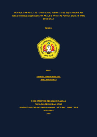 Adirama, Safrina Isnaini (2024) PENINGKATAN KUALITAS TERASI UDANG REBON (Acetes sp.) TERINOKULASI Tetragenoccocus halophillus SERTA ANALISIS AKTIVITAS PEPTIDA BIOAKTIF YANG DIHASILKAN. Undergraduate thesis, UPN Veteran Jawa Timur.