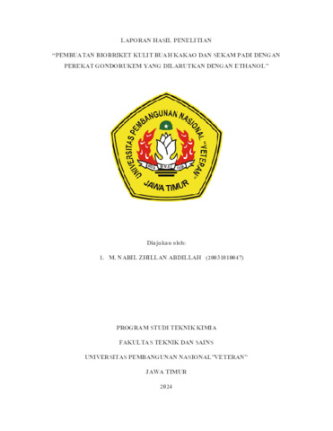 Abdillah, muhammad nabil zhillan (2024) PEMBUATAN BIOBRIKET KULIT BUAH KAKAO DAN SEKAM PADI DENGAN PEREKAT GONDORUKEM YANG DILARUTKAN DENGAN ETHANOL. Undergraduate thesis, UPN Veteran Jawa Timur.