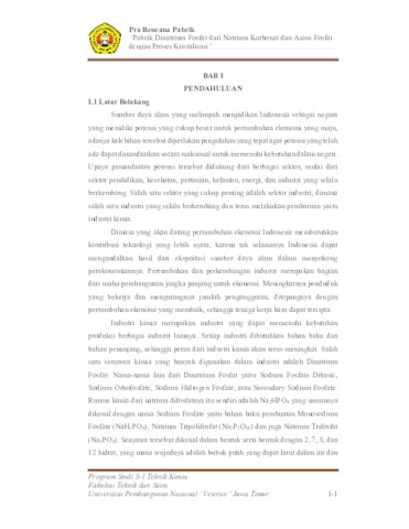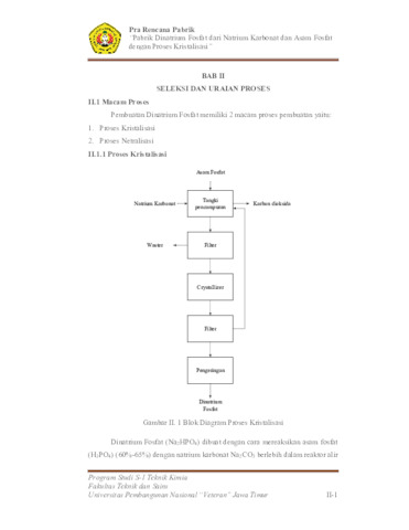 Disodium Phosphate which has another name is Sodium Phosphate Dibasic is a phosphate compound which is an intermediate product (intermediate product) which is widely used in the chemical industry. In the chemical industry, this compound used as raw material for detergent, as a water softener, for silk weighting in the textile industry, for leather tanning, and industrial materials paper. In making Disodium Phosphate, the Crystallization method is used, because the process is the most efficient and effective, apart from the yield and purity the product obtained is quite high. Establishment of a Disodium Phosphate Factory with raw materials for Sodium Carbonate and Phosphoric Acid with a crystallization process has a capacity of 95000 tons/year and was established in the Gresik Industrial Area, Gresik District, Gresik Regency, East Java. This factory will be established by using a 24 hour continuous operating system with 330 working days employees totaling 127 employees. The raw material for making Disodium Phosphate is Phosphoric Acid 75% obtained from PT Petrokimia Gresik and Natrium Carbonate obtained from PT. AKR Corporindo, Surabaya.