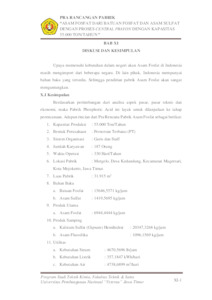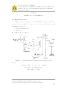Proses pembuatan asam fosfat pada pabrik ini menggunakan proses Central Prayon. Tahapan pertama dalam pembuatan asam fosfat adalah batuan fosfat yang mengandung min. 30% P2O5 dengan ukuran yang seragam (4 mesh). diangkut dengan Belt Conveyor (J-121) dan Bucket Elevator (J-122) menuju Hopper I (F�123) sebelum masuk kedalam Reaktor I (R-210). Setelah itu, Phosphate rock direaksikan dengan H2SO4 dengan konsentrasi 70% di Reaktor I (R-210) menjadi slurry pada kondisi suhu 80oC selama 2 jam. Slurry dari Reaktor I (R-220) kemudian direaksikan dengan batuan fosfat 10% berat di Reaktor II (R-230) dengan kondisi suhu 75oC selama 2 jam. Pada Reaktor I dan Reaktor II, terjadi reaksi antara batuan phospat dengan H2SO4 membentuk asam phospat (H3PO4) dan kalsium sulfat dihidrat (CaSO4.2H2O). Pada Reaktor II suhu operasi lebih rendah di bandingkan pada Reaktor I yaitu 75℃ pada tekanan 1 atm selama 2 jam. Reaksi bersifat eksotermis sehingga dibutuhkan air pendingin yang dilewatkan dalam jaket untuk menjaga suhu pada reaktor sesuai dengan kondisi optimumnya, campuran gas hasil reaksi yaitu CO2 dan SiF4 yang keluar pada bagian atas reaktor dan dialirkan ke scrubber (D-340) untuk melarutkan gas SiF4 dengan air proses sehingga tidak mencemari lingkungan dan menjadi larutan asam heksafluorosilikat (H2SiF6). Larutan H2SiF6 kemudian ditampung dalam tangki penampung H2SiF6 (F-430). Produk dari Reaktor II berupa campuran solid dan liquid (slurry) keluar dan kemudian dipompa menuju ke Tilting Pan Filter I (H-310) untuk memisahkan antara cake dan filtrat, filtrat yang didapat berupa produk asam fosfat dan cake yang didapat berupa kalsium sulfat dihidrat (CaSO4.2H2O). Kemudian filtrat asam fosfat dipekatkan menggunakan Evaporator (V-320). Produk atas vapor berupa H2O yang kemudian dialirkan menuju Kondensor (E-322) untuk diubah fasenya menjadi cair sebelum dialirkan ke Unit Waste Water Treatment. Produk bawah evaporator berupa dan asam fosfat (H3PO4) 85%, asam sulfat (H2SO4) 0,52%, dan air (H2O) 14,48% dialirkan menuju Cooler (E-323) untuk diturunkan suhunya menjadi 31oC dan kemudian dialirkan menuju Tangki Penyimpanan Asam Fosfat (F-410). Untuk cake slurry keluaran tilting pan filter II dilanjutkan ke proses selanjutnya. Cake slurry tersebut dialirkan menggunakan screw conveyor menuju reaktor konversi (R-230), pada reaktor ini ditambahkan H2SO4 98% sehingga terjadi dekomposisi gypsum dihidrat (CaSO4.2H2O) menjadi gypsum hemihidrat (CaSO4.1/2H2O) melalui pemanasan hingga 95℃ selama 1 jam. Selama proses pemanasan, gypsum kehilangan 1,5 g mol dari 2 g mol air dan berubah menjadi kalsium sulfat hemihidrat, peningkatan panas pada Reaktor III (R-230) akan mengeluarkan sisa air pada kristal dihidrat dan ukuran kristal akan semakin besar sehingga akan memudahkan proses filtrasi. Kemudian gypsum berupa kalsium sulfat hemihidrat dilakukan penyaringan filtrat yang masih mengandung asam fosfat menggunakan Titling pan Filter II (H-330), filtrat dialirkan ke evaporator, sementara itu gypsum dilakukan pencucian pada 2nd filtration. Keluaran proses ini menghasilkan produk samping kalsium sulfat hemihidrat (CaSO4. 1/2H2O) yang kemudian dialirkan menuju silo penyimpanan gypsum (F-420)