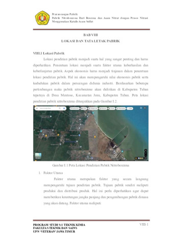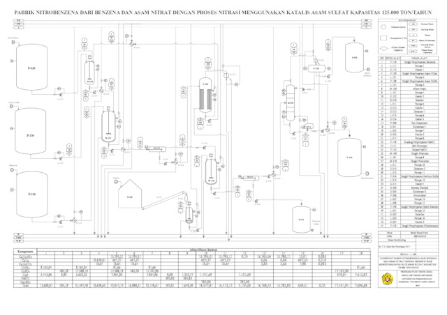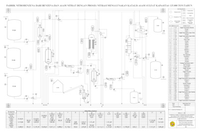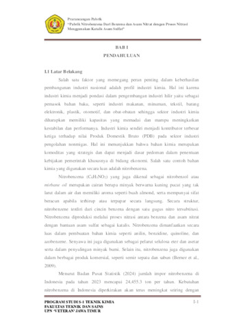 Nitrobenzena (C6H5NO2) yang juga dikenal sebagai nitrobenzol atau mirbane oil merupakan cairan berupa minyak berwarna kuning pucat yang tak larut dalam air dan memiliki aroma seperti buah almond, serta mempunyai sifat beracun apabila terhirup atau terpapar secara langsung. Nitrobenzena dimanfaatkan secara luas dalam pembuatan bahan kimia seperti anilin, benzidine, quinoline, dan azobenzene. Senyawa ini juga digunakan sebagai pelarut selulosa eter dan asetar serta dalam penyulingan minyak bumi. Selain itu, nitrobenzena juga digunakan dalam berbagai produk komersial, seperti semir sepatu dan sabun. Menurut Badan Pusat Statistik (2024) jumlah impor nitrobenzena di Indonesia pada tahun 2023 mencapai 24,455.3 ton per tahun. Kebutuhan nitrobenzena di Indonesia diperkirakan akan terus meningkat seiring dengan meningkatnya kebutuhan manusia dan tumbuhnya industri hilir di Indonesia yang membutuhkan nitrobenzena sebagai bahan bakunya. Perencanaan pendirian pabrik Nitrobenzena dengan kapasitas 125.000 ton/tahun dapat membantu dalam memenuhi kebutuhan di dalam negeri.