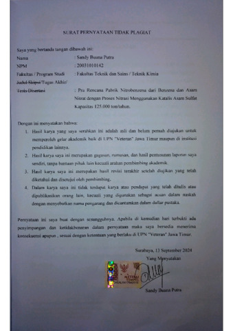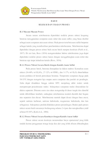 Putra, Sandy Buana (2024) PRA RANCANGAN PABRIK NITROBENZENA DARI BENZENA DAN ASAM NITRAT DENGAN PROSES NITRASI MENGGUNAKAN ASAM SULFAT KAPASITAS 125.000 TON/TAHUN. Undergraduate thesis, UPN "VETERAN" JAWA TIMUR.