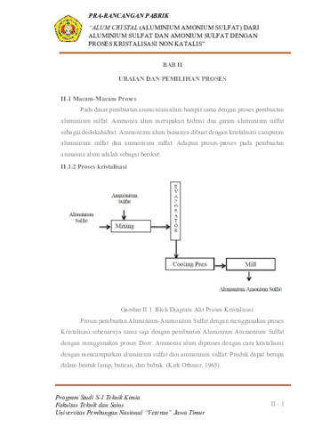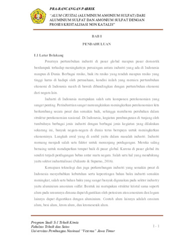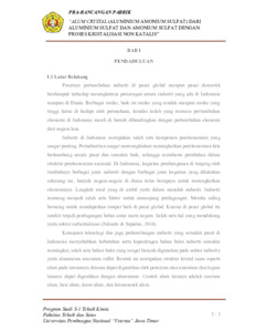 PRA RANCANGAN PABRIK KRISTAL ALUM (ALUMINIUM AMONIUM SULFAT) DARI ALUMINIUM SULFAT DAN AMONIUM SULFAT DENGA PROSES KRISTALISASI NON KATALIS