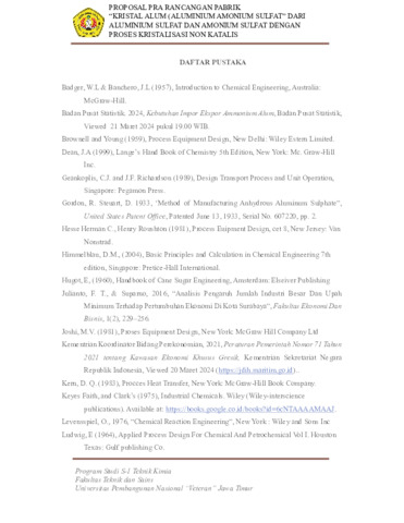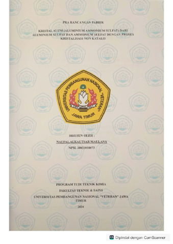 Maulana, Naufal Alkautsar (2024) PRA RANCANGAN PABRIK KRISTAL ALUM (ALUMINIUM AMONIUM SULFAT) DARI ALUMINIUM SULFAT DAN AMONIUM SULFAT DENGA PROSES KRISTALISASI NON KATALIS. Undergraduate thesis, Universitas Pembangunan Nasional "Veteran" Jawa Timur.