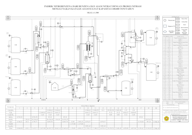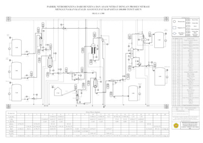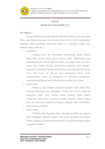 Pabrik nitrobenzena dari benzena dan asam nitrat dengan proses nitrasi menggunakan katalis asam sulfat kapasitas 100.000 ton/tahun akan didirikan di Kawasan Industri Tuban (KIT) Desa Socorejo, Kecamatan Jenu, Kabupaten Tuban, Jawa Timur. Nitrobenzena sendiri merupakan bahan baku utama dalam proses sintesis anilin. Nitrobenzena juga dimanfaatkan pada industri pewarna tekstil, cat, pelapis, tinta, dan semir sepatu. Pada bidang farmasi, nitrobenzena digunakan pada produksi analgesik asetaminofen atau parasetamol yang umum digunakan di seluruh dunia. Pabrik nitrobenzena direncanakan beroperasi secara kontinyu selama 24 jam dalam sehari, 330 hari dalam setahun Pabrik ini menggunakan bahan baku utama benzena yang diperoleh dari PT Trans-Pacific Petrochemical Indotama yang berlokasi di Tuban, Jawa Timur dan asam nitrat yang diperoleh dari PT Multi Nitrotama Kimia yang berlokasi di Cikampek, Jawa Barat. Bahan baku penunjang yang digunakan adalah asam sulfat yang diperoleh dari PT Petrokimia Gresik yang berlokasi di Gresik, Jawa Timur dan natrium hidroksida yang diperoleh dari PT Tjiwi Kimia yang berlokasi di Sidoarjo, Jawa Timur. Proses pembuatan nitrobenzena dilakukan dengan cara mereaksikan antara benzena dan asam nitrat dalam reaktor dengan kondisi operasi 55oC dan tekanan 1 atm. Reaksi berlansung selama 30 menit dengan yield yang diperoleh sebesar 99%. Produk yang dihasilkan diumpankan menuju dekanter untuk dipisahkan dari sisa asam yang tidak bereaksi. Kemudian, nitrobenzena dialirkan menuju menara distilasi untuk dipisahkan dari sisa benzena berlebih sehingga diperoleh nitrobenzena dengan kemurnian 99,8%. Ketentuan pendirian pabrik nitrobenzena yang telah direncanakan dapat disimpulkan sebagai berikut: 1. Kapasitas Produksi : 100.000 ton/tahun; 2. Bentuk Organisasi : Perseroan Terbatas (PT); 3. Sistem Organisasi : Garis dan Staf; 4. Lokasi Pabrik : Kawasan Industri Tuban (KIT); 5. Luasan Pabrik : 17.250 m2; 6. Sistem Operasi : Kontinyu; 7. Waktu Operasi : 330 hari/tahun; 24 jam/hari; 8. Jumlah Karyawan : 200 orang; 9. Harga Produk Nitrobenzena :Rp 30.000/kg; 10. Analisis Ekonomi : a. Masa Konstruksi : 2 tahun; b. Tahun Operasi : 10 tahun; c. Modal Tetap (FCI) : Rp 496.782.458.405; d. Working Capital Investment (WCI) : Rp 793.019.130.660; e. Total Capital Investment (TCI) : Rp 1.289.801.589.065; f. Total Production Cost (TPC) : Rp 3.172.076.522.640; g. Total Penjualan : Rp 3.583.657.833.669; h. Depresiasi Total : Rp 9.471.109.293 ; i. Return of Investment Sebelum Pajak : 26,83%; j. Return of Investment Sesudah Pajak : 20,12%; k. Internal Rate of Return (IRR) : 14,22%; l. Pay Back Period (PBP) : 2 tahun 9 bulan; m. Break Event Point (BEP) : 28,38%