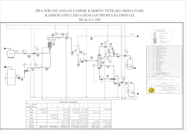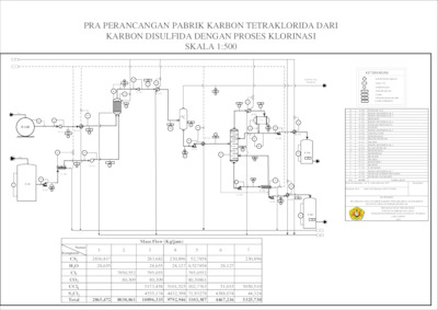 Pabrik Cabon Tetrachloride dari Carbon Disulfide dan Chlorine dengan Proses Klorinasi dengan kapasitas 40.000 ton/ tahun akan didirikan didirikan di Desa Rawa Arum, Purwakarta, Cilegon, Banten. Pabrik ini beroperasi selama 24 jam dalam sehari, 330 hari dalam setahun dengan bahan baku yang digunakan yaitu carbon disulfide dan chlorine. Carbon tetrachloride secara luas digunakan sebagai pelarut dalam industri karet, Digunakan sebagai pelarut dalam bahan kimia dan industri obat, Digunakan sebagai pelarut dalam industri cat, Digunakan sebagai anthelmintic untuk parasit dalam praktek kedokteran. Pada tahap persiapan bahan baku, carbon disulfida liquid dari tangki penyimpanan dengan suhu 30oC pada tekanan 1 atm dialirkan dengan bantuan pompa sentrifugal menuju vaporizer untuk diuapkan sampai suhu 120oC. Uap carbon disulfida yang keluar dari vaporizer dialirkan menggunakan blower menuju reaktor. Sedangkan Cl2 dari tangki penyimpanan sebelum masuk reaktor dilewatkan expander untuk menurunkan tekanan menjadi 1 atm dan dilewatkan heater untuk menaikkan suhu menjadi 120oC supaya suhu Cl2 sesuai dengan kondisi operasi reaktor. Pada tahap ini carbon disulfida dan klorin dialirkan menuju reaktor dan direaksikan dalam reaktor pada suhu 120oC dan tekanan 1 atm, serta reaksi bersifat eksotermis sehingga membutuhkan proses pendinginan untuk menjaga agar kondisi operasi didalam reaktor tetap stabil. Sebelum masuk flash distilasi campuran bahan diturunkan tekananya menjadi 0,9 atm menggunakan kompresor dan didinginkan mengunakan kondensor sampai temperature 50oC. Didalam flash distilasi terjaadi pemisahan antara gas Cl2 yang lebih banyak (bagian atas) dan liquid (bagian bawah yang mengandung S2Cl2, CCl4 ). Fase liquid dialirkan menuju kolom distilasi menggunakan pompa dan dipanaskan menggunakan heater hingga bubble point nya, yaitu 86oC, didalam kolom distilasi terjadi proses pemisahan campuran berdasarkan perbedaan titik didihnya, dimana didapatkan produk atas yaitu CCl4, dan produk bawah S2Cl2. Pada produk atas sebelum masuk tangki penyimpanan produk CCl4 didinginkan menggunakan cooler dan dialirkan menggunakan pompa . Untuk produk bawah mengandung S2Cl2 Sebelum masuk tangki penyimpanan produk dilakukan pendinginan menggunakan cooler dan dialirkan menggunakan pompa. Perencanaan Operasi : - Kapasitas pabrik : 40.000 ton/tahun - Bahan baku : Carbon Disulfide dan Klorin - Bentuk perusahaan : Perseroan Terbatas (PT) - Struktur Organisasi : Garis dan Staff - Jumlah tenaga kerja : 116 Orang - Lokasi Pabrik : Desa Rawa Arum, Cilegon, Banten - Fixed Capital Investment : Rp. 8.070.865.067.664 - Working Capital Investment : Rp. 2.061.273.200.457 - Total Capital Investment : Rp. 10.234.483.099.113 - Internal Rate of Return : 22 % - ROI (Sebelum Pajak) : 36% - ROI (Setelah Pajak) : 27% - Pay of Period : 4 Tahun 5 Bulan - Break Event Point : 37,8 %