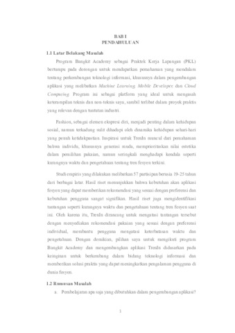 Yayasan Dicoding Indonesia yang biasa dikenal sebagai Dicoding adalah sebuah perusahaan startup yang bertujuan mengembangkan ekosistem developer di Indonesia. Berdiri sejak 5 Januari 2015. Yayasan Dicoding Indonesia memiliki program Studi Independen yaitu Bangkit Academy. Sebagai bagian dari program ini, Bangkit Academy menawarkan capstone project, sebuah penilaian akhir yang mengharuskan peserta untuk mengembangkan sebuah aplikasi berbasis Android. Dalam hal ini, penulis mengangkat tema fashion sebagai fokus utama dalam pengembangan aplikasi. Dalam sebuah penelitian terbaru dengan 57 partisipan dari berbagai latar belakang, terutama kaum muda, fashion muncul sebagai sarana penting untuk mengekspresikan diri. Daya tarik estetika, kombinasi warna, kenyamanan, dan kesesuaian dengan aktivitas merupakan faktor kunci yang mempengaruhi pilihan pakaian. Studi ini menggarisbawahi permintaan akan aplikasi fesyen yang dipersonalisasi. Para responden menyoroti tantangan seperti keterbatasan waktu, pengetahuan yang terbatas tentang tren, dan ketakutan akan penilaian. Tim proyek akan terlibat dalam beberapa tahapan pengembangan yang melibatkan berbagai bidang keahlian. Dalam aspek Machine Learning, fokus utama adalah membangun dua model menggunakan TensorFlow, satu untuk kategorisasi gambar dan yang lainnya untuk klasifikasi warna. Proyek ini tidak lepas dari kontribusi tim Cloud Computing untuk backend development dan tim Mobile Development sebagai implementasi kedalam aplikasi Android.