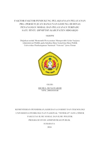Munawaroh, Richul (2024) FAKTOR-FAKTOR PENDUKUNG PELAKSANAAN PELAYANAN PBG (PERSETUJUAN BANGUNAN GEDUNG) DI DINAS PENANAMAN MODAL DAN PELAYANAN TERPADU SATU PINTU (DPMPTSP) KABUPATEN SIDOARJO. Undergraduate thesis, UPN 'VETERAN' JAWA TIMUR.