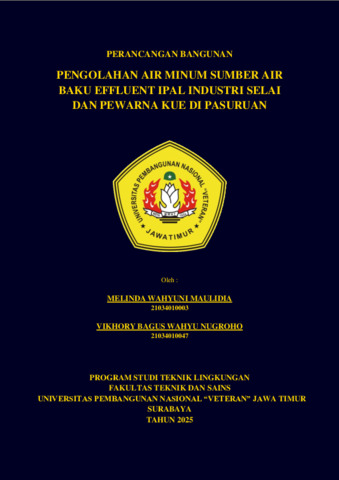 Maulidia, Melinda Wahyuni and Nugroho, Vikhory Bagus Wahyu (2025) PERANCANGAN BANGUNAN PENGOLAHAN AIR MINUM SUMBER AIR BAKU EFFLUENT IPAL INDUSTRI SELAI DAN PEWARNA KUE DI PASURUAN. Undergraduate thesis, UPN "Veteran" Jawa Timur.