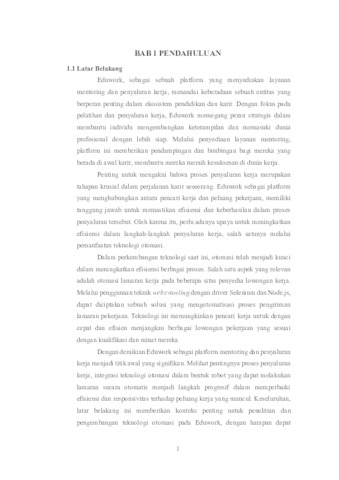 Eduwork adalah platform yang menyediakan layanan mentoring dan penyaluran kerja, memainkan peran penting dalam memfasilitasi perkembangan keterampilan dan persiapan individu menuju dunia profesional. Proses penyaluran kerja menjadi tahap krusial dalam perjalanan karir seseorang, sehingga efisiensi dalam proses ini sangat diperlukan. Untuk meningkatkan efisiensi penyaluran kerja, integrasi teknologi otomasi menjadi solusi yang relevan. Teknologi web crawling dengan menggunakan Selenium dan Node.js digunakan untuk mengembangkan robot otomatis yang dapat mengirim lamaran pekerjaan secara otomatis pada berbagai situs penyedia lowongan kerja. Teknologi ini membantu pencari kerja menjangkau lebih banyak peluang dengan cepat dan efisien sesuai kualifikasi dan minat mereka. Tujuan dari PKL ini adalah mengembangkan robot otomasi lamaran kerja, yang diharapkan dapat meningkatkan efisiensi dalam penyaluran kerja oleh Eduwork. Dengan teknologi otomasi, proses pengiriman lamaran menjadi lebih responsif terhadap peluang kerja yang ada, menghemat waktu dan tenaga pencari kerja. Hasilnya diharapkan dapat memberikan kontribusi positif bagi pengalaman pengguna dan efektivitas layanan Eduwork dalam penyaluran kerja.