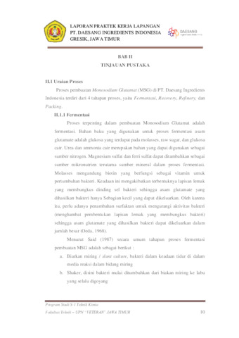 Yanti, Selvia Sofi (2023) Laporan Praktik Kerja Lapangan Proses Pembuatan MSG (Monosodium Glutamic) di PT. Daesang Ingredients Indonesia. Project Report (Praktek Kerja Lapang dan Magang). Selvia Sofi Yanti. (Unpublished)