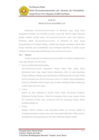 Hexamehtylenetetramin merupakan senyawa yang memiliki kegunaan sangat luas dalam industri kimia. Senyawa ini digunakan sebagai akselerator dan penstabil resin cair pada pembuatan karet dan resin. Sehingga membuat kebutuhan akan Hexamethylenetetramine semakin besar dan penting di dunia industri. Peluang didirikannya pabrik Hexamethylenetetramine di Indonesia cukup besar, maka perlu direncanakan perancangan pabrik kimia dengan produk hexamethylenetetramine. Pabrik ini direncanakan akan berdiri pada tahun 2028 dengan kapasitas 50.000 ton/tahun di daerah Undar Andir, Kecamatan Kragilan, Kabupaten Serang, Banten. Pabrik beroperasi selama 330 hari dalam setahun dengan jumlah tenaga kerja 220 Karyawan. Pembuatan Hexamethylenetetramine menggunakan proses Weiss, dimana proses ini dilakukan dengan mereaksikan ammonia dan formaldehida di dalam reaktor. Reaktor beroperasi pada kondisi temperatur 75℃ dan tekanan 1 atm. Di dalam reaktor terjadi reaksi yang bersifat irreversible, dan eksotermis. konversi yang dihasilkan adalah 93%. Produk yang telah keluar dari reactor selanjutnya dihilangkan pelarutnya menggunakan evaporator. Setelah dari evaporator, produk dikristalkan dengan alat crystallizer kemudian dipisahkan antara kristal dengan mother liquor menggunakan centrifuge. Proses selanjutnya produk dikeringkan menggunakan rotary dryer untuk menghilangkan kadar air dalam produk. Produk yang dihasilkan memiliki konsentrasi sebesar >99% kemudian produk dialirkan ke tangki penyimpanan produk.
