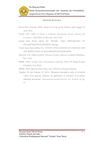 ANJUDA, ADLI PUTRA (2024) PABRIK HEXAMETHYLENETETRAMINE DARI AMMONIA DAN FORMALDEHIDA DENGAN PROSES WEISS KAPASITAS 45.000 TON/TAHUN. Undergraduate thesis, Universitas Pembangunan Nasional "Veteran" Jawa Timur.