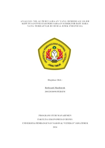 Manihuruk, Ruthyanti (2024) Analisis Nilai Perusahaan yang Dimediasi Oleh Keputusan Investasi Perusahaan Subsektor Batu Bara yang Terdaftar di Bursa Efek Indonesia. Undergraduate thesis, UPN Veteran Jawa Timur.