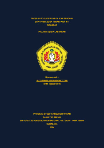 DZAKIYYAH, BUTSAINAH ABIDAH (2024) Proses Produksi Pempek Ikan Tenggiri di PT Primaboga Nusantara Inti Sidoarjo. Project Report (Praktek Kerja Lapang dan Magang). UPN Veteran Jawa Timur. (Unpublished)