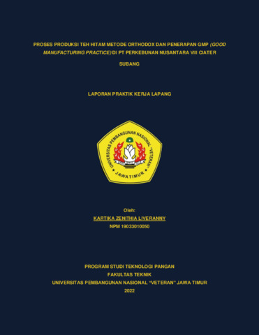 LIVERANNY, KARTIKA ZENITHIA PROSES PRODUKSI TEH HITAM METODE ORTHODOX DAN PENERAPAN GMP (GOOD MANUFACTURING PRACTICE) DI PT PERKEBUNAN NUSANTARA VIII CIATER SUBANG. Project Report (Praktek Kerja Lapang dan Magang). UPN Veteran Jawa Timur. (Unpublished)