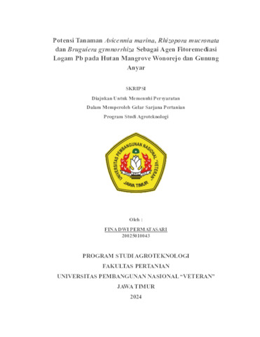 Fina Dwi, Permatasari (2024) Potensi Tanaman Avicennia marina, Rhizopora mucronata dan Bruguiera gymnorrhiza Sebagai Agen Fitoremediasi Logam Pb pada Hutan Mangrove Wonorejo dan Gunung Anyar. Undergraduate thesis, Faculty of Agriculture, UPN "Veteran" Jawa Timur.