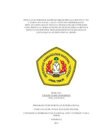 CHALID SYAMY, SYAMY (2024) PENGUATAN PERSONIL KEMENKUMHAM MELALUI REVISI UU NO. 6 TAHUN 2011 PASAL 3 AYAT 4 TENTANG KEIMIGRASIAN : RENCANA PENGADAAN SENJATA API BAGI PEJABAT PERSONIL YANG BERTUGAS SEBAGAI PENEGAK HUKUM SEBAGAI BENTUK PENGUATAN PERSONIL MENGHADAPI POTENSI KEJAHATAN LINTAS BATAS (INTERNATIONAL CRIME). Project Report (Praktek Kerja Lapang dan Magang). Universitas Pembangunan Nasional (UPN) "Veteran" Jawa Timur. (Unpublished)