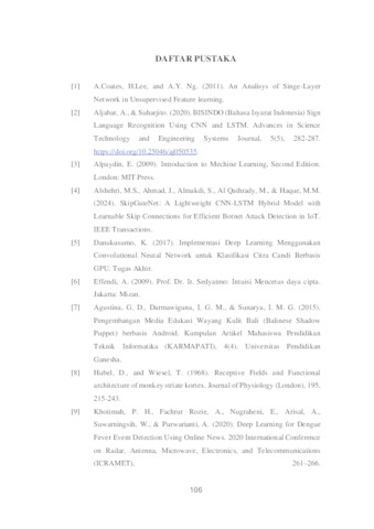 Kurnianto, Achmad Fajar (2024) IMPLEMENTASI CONVOLUTIONAL NEURAL NETWORK (CNN) DAN LONG SHORT-TERM MEMORY RECCURENT (LSTM) PADA PENGENALAN TOKOH WAYANG KULIT BERBASIS ANDROID. Undergraduate thesis, UNIVERSITAS PEMBANGUNAN NASIONAL "VETERAN" JAWA TIMUR.