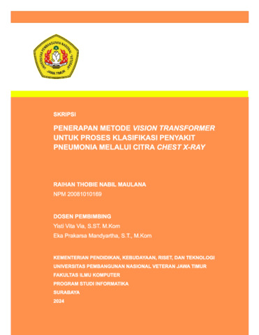 Maulana, Raihan Thobie Nabil (2024) Penerapan Metode Vision Transformer untuk Proses Klasifikasi Penyakit Pneumonia melalui Citra Chest X-Ray. Undergraduate thesis, UPN Veteran Jawa Timur.