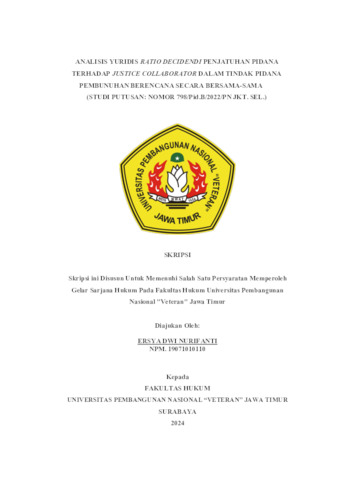ERSYA, DWI NURIFANTI (2024) ANALISIS YURIDIS RATIO DECIDENDI PENJATUHAN PIDANA TERHADAP JUSTICE COLLABORATOR DALAM TINDAK PIDANA PEMBUNUHAN BERENCANA SECARA BERSAMA-SAMA (STUDI PUTUSAN: NOMOR 798/Pid.B/2022/PN JKT. SEL.). Undergraduate thesis, Universitas Pembangunan Nasional "Veteran" Jawa Timur.