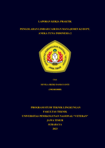 Damayanti, Sevila Rizki and Novembrianto, Rizka LAPORAN KERJA PRAKTIK PENGOLAHAN LIMBAH CAIR DAN MANAJEMEN K3 DI PT. ANEKA TUNA INDONESIA 2. Project Report (Praktek Kerja Lapang dan Magang). UPN "Veteran" Jawa Timur. (Unpublished)