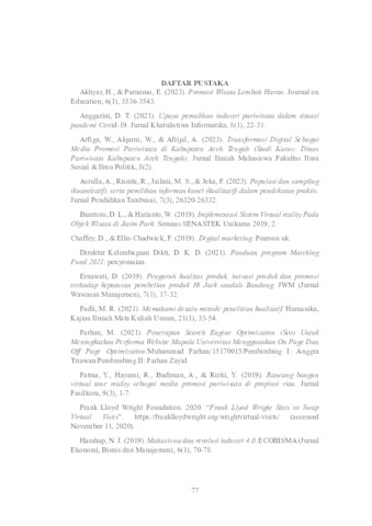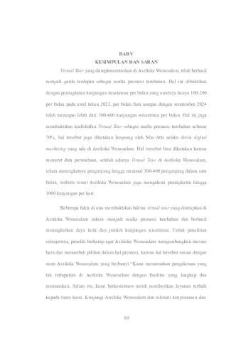 Awal mula munculnya Virtual tour ditandai ketika Covid-19 mewabah ke seluruh dunia. Covid-19 merupakan wabah pandemi global yang menyebar dan berdampak pada hampir seluruh negara dan wilayah. Virtual Tour merupakan simulasi dari sebuah lokasi yang ada, terdiri dari serangkaian gambar diam yang dibentuk oleh panorama dengan tampilan yang tidak terputus, dalam virtual tour dapat ditambahkan elemen multimedia seperti efek suara, musik, narasi, dan teks. Virtual Tour sendiri dapat digunakan untuk melihat secara langsung kondisi suatu destinasi pariwisata. Virtual tour membuat wisatawan akan seolah-olah berada dan merasakan sensasi dan situasi di destinasi yang divirtualisasikan. Salah satu destinasi pariwisata yang menggunakan teknologi virtual tour adalah Asriloka Wonosalam yang berada di Wonosalam. Penelitian ini menggunakan metode penelitian kualitatif dengan pendekatan deskriptif. Pengumpulan data dalam penelitian ini menggunakan teknik wawancara. Peneliti mewawancarai divisi digital marketing Asriloka Wonosalam dan pengunjung yang pernah berkunjung ke Asriloka Wonosalam. Setelah melakukan pengumpulan data dan wawancara dengan narasumber terkait, didapatkan hasil bahwa terbukti virtual tour di Asriloka Wonosalam memiliki efektivitas sebesar 70% sebagai media promosi tambahan. Hal ini dibuktikan dengan adanya peningkatan jumlah kunjungan yang sebelumnya 100-200 pengunjung per bulan. Per Juni 2024 sekarang, pengunjung di Asriloka mencapai 300-400 pengunjung per bulan.