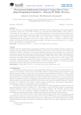 Prasasti, Andhyanerra Irsia and Cahyonugroho, Okik Hendriyanto (2024) Perencanaan Implementasi Strategi Creating Shared Value dalam Pengelolaan Limbah Ex - Blasting PT INKA (Persero). Perencanaan Implementasi Strategi Creating Shared Value dalam Pengelolaan Limbah Ex - Blasting PT INKA (Persero), IX (3). pp. 1-6. ISSN 2541-1934
