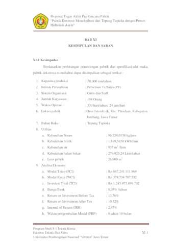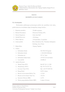 Judul Pabrik Sistem operasi : Kontinyu Waktu operasi : 330 hari/tahun ; 24 jam/hari Luas tanah : 20.000 m2 Lokasi pabrik : Desa Jatimlerek, Kec. Plandaan, Kabupaten Jombang, Jawa Timur Jumlah karyawan : 194 orang Bentuk perusahaan : Perseroan Terbatas (PT) Struktur organisasi : Garis dan staff Perencanaan Pabrik Dextrose Monohydrate dari Tepung Tapioka dengan Proses Hidrolisis Asam ini direncanakan dengan kapasitas produksi sebesar 80.000 ton/tahun layak didirikan. Dextrose Mohohydrate merupakan bahan kimia yang banyak digunakan dalam industri makanan dan minuman sebagai pemanis pada produk. Secara singkat uraian proses dari pabrik dextrose monohydrate sebagai berikut : pertama – tama tepung tapioka di campur dengan air dan kemudian di tambahkan HCl dan dipanaskan sehingga terbentuk larutan dextrose. Larutan dextrose kemudian dipekatkan menggunakan evaporator, dikristalkan menggunakan crystallizer dan dikeringkan menggunakan rotary dryer lalu diseragamkan ukurannya menggunakan ball mill dan siap untuk dipasarkan. Analisa Ekonomi : 1. Masa Konstruksi : 2 tahun 2. Umur pabrik : 10 tahun 3. FCI : Rp. 867.241.111.696 4. WCI : Rp. 378.734.787.732 5. TCI : Rp. 1.245.975.899.702 6. Biaya bahan baku (1 tahun) : Rp. 1.038.967.965.742 7. Biaya utilitas Listrik Air Bahan bakar Steam 8. Biaya produksi total 9. Hasil penjualan 10. Bunga Bank 11. ROI (Sebelum Pajak) 12. ROI (Sesudah Pajak) 13. Payback Time 14. IRR 15. BEP : Rp. 88.200.274.499 : 1.169,5650 kWh/jam : 937 m3 /jam : 279.923,24 Liter/tahun : 96.550,0138 kg/jam : Rp. 1.514.939.150.929,16 : Rp. 1.760.000.000.000,00 : 8,05% /tahun : 13,76% : 10,32% : 8 tahun 10 bulan : 2,47% : 34,33%