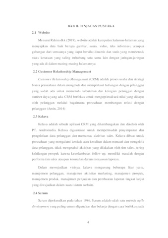 PT Andromedia is a company engaged in information technology consulting. One of the products of PT Andromedia is Kelava, which is a Customer Relationship Management (CRM) application intended to assist in managing the company's marketing process. However, Kelava does not yet support a sales system that can be done directly by customers. Therefore, a Customer Relationship Platform (CRP) system was designed and developed that allows customers to sell directly to customers, to make transactions directly through the website. To develop CRP system, the Scrum method is used to accelerate the flow of the process and make the development process more structured and systematic. This CRP system was developed as a child system of Kelava so that it can directly synchronize with the existing CRM system. so that it can directly synchronize with the pre-existing CRM system. In this field work practice, a CRP system was produced system that allows users to conduct online transactions through website and directly integrated with Kelava's existing CRM system. Keywords: Customer Relationship Management (CRM), Customer Relationship Platform (CRP), Scrum