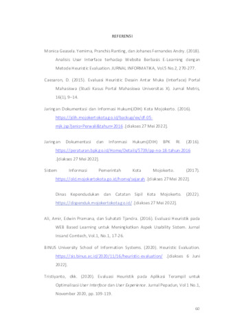 With the development of information technology, there is also an increase in the ways to complete a job. One of them is recording the administration process by using the population administration application. Application A good application is an application that can be useful for its users. With this we will analyze the user interface of the populationadministration application to improve the usability and usefulness of the application using the Heuristic Evaluation method which consists of 10 principle rules proposed by Molich and Nielsen. by Molich and Nielsen. Heuristic Evaluation according to the definition of interaction - design, heuristic evaluation is a process in which experts use rules of to measure the usability of user interfaces in an independent search and report problems. and reporting problems. The results of the analysis generally show that this application already has a fairly good interface design based on the 10 principles of heuristic evaluation. based on the 10 principles of heuristic evaluation. But there are some things that need to be to be improved for better ease of use.