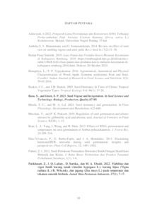 Kawista (Limonia acidissima L.) adalah tanaman buah yang memiliki banyak manfaat sebagai bahan baku untuk makanan, minuman, dan obat-obatan. Populasi kawista yang rendah akibat biji yang sulit untuk berkecambah, atau mengalami dormansi. Salah satu metode untuk mengatasi dormansi dengan menggunakan kalium nitrat (KNO3). Penelitian ini dilakukan dari Juli hingga September 2024 menggunakan Rancangan Acak Lengkap Faktorial. Faktor pertama adalah konsentrasi KNO3, yang terdiri dari enam taraf: Air (0%), 0,25%, 0,5%, 0,75%, 1,00%, dan 1,25%. Faktor kedua adalah lama perendaman, dengan dua taraf: 12 jam dan 24 jam. Penelitian ini memiliki 12 kombinasi perlakuan, yang masing-masing diulang tiga kali. Data dianalisis menggunakan (ANOVA) apabila terjadi pengaruh nyata dilakukan uji lanjut BNJ 5%. Hasil penelitian terdapat interaksi antara kombinasi konsentrasi KNO3 dan durasi perendaman terhadap viabilitas dan vigor benih kawista. Perlakuan dengan konsentrasi KNO3 1,00% dan perendaman selama 12 jam menghasilkan nilai perkecambahan tertinggi, sementara konsentrasi KNO3 1,00% dengan perendaman selama 24 jam menghasilkan nilai indeks vigor tertinggi. Terjadi pengaruh nyata terhadap perlakuan tunggal konsentrasi KNO3 terhadap parameter panjang plumula. Perlakuan tunggal lama perendaman tidak terjadi pengaruh nyata pada semua parameter. Kata Kunci: Konsentrasi, Lama Perendaman, KNO3, Kawista, Viabilitas, Vigor.