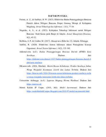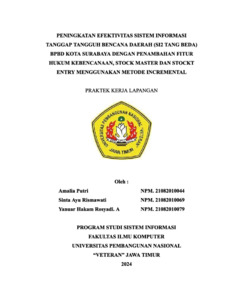Kota Surabaya sebagai kota metropolitan terbesar kedua di Indonesia menghadapi berbagai ancaman bencana, baik alam maupun non-alam, seperti banjir, pohon tumbang, dan kebakaran. Badan Penanggulangan Bencana Daerah (BPBD) Kota Surabaya memiliki peran penting dalam mengkoordinasikan upaya mitigasi, kesiapsiagaan, tanggap darurat, dan pemulihan. Namun, sistem informasi tanggap bencana yang ada masih memiliki keterbatasan, terutama dalam integrasi data dan respons waktu nyata terhadap laporan kejadian bencana. Hal ini menghambat efektivitas penanganan bencana secara cepat dan efisien. Untuk mengatasi permasalahan tersebut, praktek kerja lapangan ini mengusulkan peningkatan efektivitas Sistem Informasi Tanggap Tangguh Bencana Daerah (SI2 TANG BEDA) BPBD Kota Surabaya dengan menerapkan metode incremental. Melalui implementasi metode incremental, diharapkan sistem informasi yang dikembangkan dapat meningkatkan kecepatan dan akurasi penyebaran informasi bencana, mempercepat pengambilan keputusan, serta memperkuat koordinasi antara BPBD dan pihak terkait. Hasil dari penelitian ini diharapkan dapat memberikan kontribusi nyata dalam meningkatkan kesiapsiagaan dan respons BPBD Kota Surabaya terhadap berbagai ancaman bencana. Kata Kunci : bencana, BPBD Kota Surabaya, website, incremental, SI2 TANG BEDA