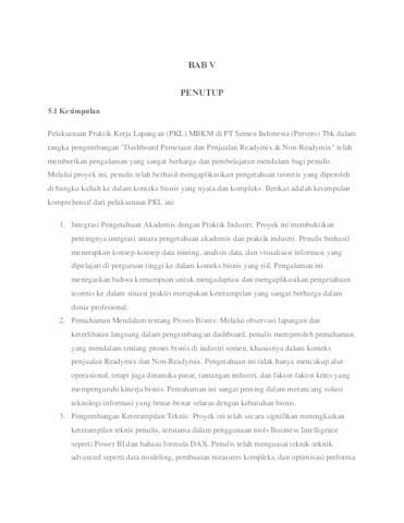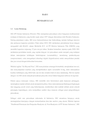 Dashboard Pemetaan dan Penjualan Readymix & Non-Readymix di PT Semen Indonesia merupakan laporan hasil magang yang bertujuan untuk menyediakan alat analisis komprehensif bagi perusahaan dalam mengoptimalkan strategi penjualan dan distribusi lini bisnis Readymix maupun Non-Readymix. Sebagai salah satu produsen semen terkemuka di Indonesia, PT Semen Indonesia terus berupaya meningkatkan kinerja bisnisnya dengan memanfaatkan analisis data yang akurat. Melalui laporan ini, perusahaan berharap dapat memetakan potensi pasar secara lebih terperinci dan merumuskan strategi yang efektif untuk memperkuat posisinya di pasar semen nasional. Laporan ini berfokus pada komponen utama: pemetaan untuk lini bisnis Readymix dan Non-Readymix. Komponen pemetaan penjualan mencakup visualisasi geografis yang menampilkan distribusi penjualan kedua lini bisnis tersebut di berbagai wilayah. Sementara itu, komponen penjualan menyajikan proyeksi penjualan Readymix dan Non-Readymix berdasarkan analisis tren historis dan faktor-faktor yang mempengaruhi permintaan pasar. Dengan adanya dashboard ini, PT Semen Indonesia dapat memperoleh wawasan yang lebih mendalam mengenai dinamika pasar untuk produk Readymix dan Non-Readymix, serta mengidentifikasi peluang dan tantangan yang ada. Informasi ini sangat berharga untuk mengoptimalkan strategi produksi, meningkatkan efisiensi rantai pasok, dan mengembangkan pendekatan pemasaran yang tepat sasaran untuk kedua lini produk tersebut di berbagai segmen pasar.
