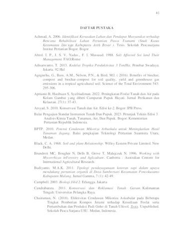 Salinitas tanah dapat merusak struktur tanah karena kandungan natrium klorida yang tinggi, menyebabkan erosi dan aerasi tanah, serta mengurangi kemampuan tanaman untuk menyerap air dan laju perkembangan tanaman. Salah satu cara untuk mengatasi masalah ini adalah dengan memperbaiki sifat kimia tanah salin. Langkah pertama dalam memperbaiki salinitas adalah mengetahui kondisi awal tanah salin sehingga dosis dapat ditentukan untuk memperbaiki kimia tanah salin nantinya. Oleh karena itu, penelitian tentang “jamur mikoriza arbuskular dan pemberian pupuk untuk memperbaiki salinitas tanah” diperlukan. Tujuan dari penelitian ini adalah untuk menentukan apakah penambahan pupuk kandang dan jamur mikoriza dalam jumlah yang tepat dapat meningkatkan karakter kimia tanah salin. Rancangan acak lengkap (RAL) dua faktor dengan dua variabel digunakan dalam penelitian ini. Hasilnya menunjukkan bahwa meskipun jamur mikoriza dan pupuk kandang tampaknya tidak berpengaruh terhadap penurunan pH, EC, KTK, C – Organik namun keduanya meningkatkan N- Tersedia (NH₄⁺ dan NO₃⁻) secara signifikan selama minggu pertama (M1K1) setelah pemberian 20 ton pupuk kandang. pupuk kandang.105CFU. jamur mikoriza, mL⁻¹ dan ha⁻¹.