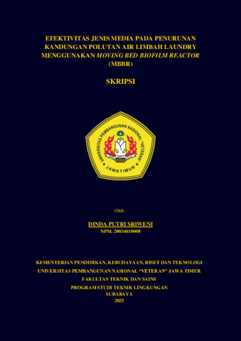 Sriweni, Dinda Putri (2025) Efektivitas Jenis Media Pada Penurunan Kandungan Polutan Air Limbah Laundry Menggunakan Moving Bed Biofilm Reactor (MBBR). Undergraduate thesis, UNIVERSITAS PEMBANGUNAN NASIONAL "VETERAN" JAWA TIMUR.