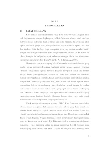 Kebencanaan adalah fenomena yang dapat menyebabkan kerugian besar bagi manusia dan lingkungan. Kota Surabaya, sebagai salah satu kota metropolitan di Indonesia, tidak terlepas dari risiko bencana, baik bencana alam maupun bencana buatan manusia. Berbagai jenis bencana seperti banjir, gempa bumi, kebakaran, dan kecelakaan industri dapat terjadi dan berdampak negatif terhadap kehidupan masyarakat dan keberlanjutan kota. Dalam situasi bencana, kecepatan dan keakuratan dalam penanggulangan sangat penting untuk meminimalkan dampak negatif yang ditimbulkan. Salah satu aspek krusial dalam penanggulangan bencana adalah ketersediaan dan distribusi bantuan. Bantuan yang dibutuhkan dapat berupa berbagai macam kebutuhan dasar seperti pakaian, sembako, kasur, dan bahan pangan lainnya. Untuk memastikan bahwa bantuan ini dapat tersedia dan didistribusikan dengan baik, diperlukan suatu sistem yang terintegrasi untuk mencatat dan mengelola ketersediaan serta distribusi bantuan tersebut. Sistem ini harus mampu memberikan informasi yang akurat dan real-time mengenai stok logistik, serta mendukung pengambilan keputusan yang cepat dan tepat oleh pihak yang berwenang. Sistem manajemen kebencanaan berbasis website yang dikembangkan untuk BPBD Kota Surabaya, yang diberi nama "Pak Tiksan", dirancang untuk memenuhi kebutuhan ini. Sistem ini bertujuan untuk meningkatkan efektivitas dan efisiensi dalam penanggulangan bencana, sehingga bantuan dapat segera disalurkan kepada masyarakat yang membutuhkan dengan lebih cepat dan tepat. Proses pengembangan sistem dimulai dengan pembuatan Entity Relationship Diagram (ERD) yang memberikan gambaran umum tentang struktur data yang akan digunakan dalam sistem ini.