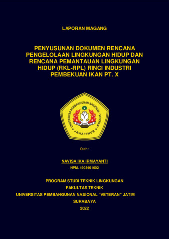 Irmayanti, Navisa Ika (2022) Penyusunan Dokumen Rencana Pengelolaan Lingkungan Hidup Dan Rencana Pemantauan Lingkungan Hidup (RKL-RPL) Rinci Industri Pembekuan Ikan PT. X. Project Report (Praktek Kerja Lapang dan Magang). Repository UPN Veteran Jawa Timur. (Unpublished)