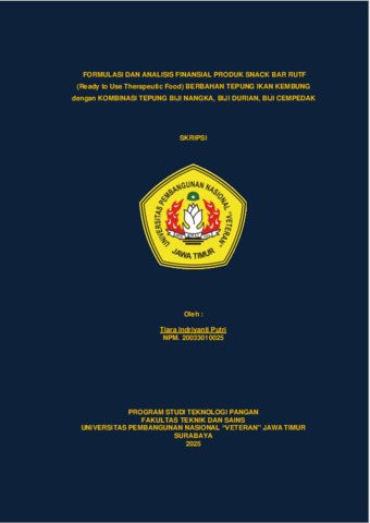 Putri, Tiara Indriyanti (2025) Formulasi dan Analisis Finansial Produk Snack bar RUTF (Ready to Use Therapeutic Food) Berbahan Tepung Ikan Kembung dengan Kombinasi Tepung Biji Nangka, Biji Durian, Biji Cempedak. Undergraduate thesis, UPN Veteran Jawa Timur.