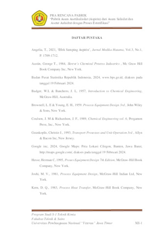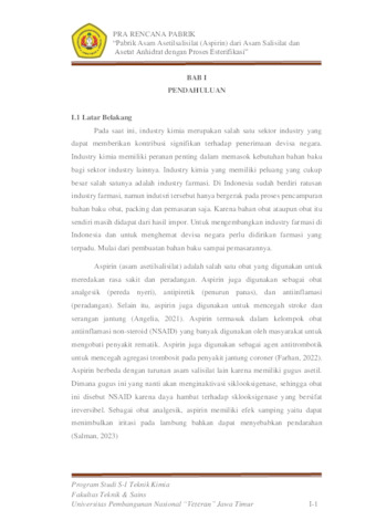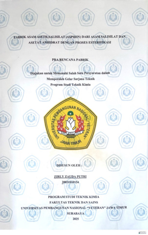 Putri, Zirly Zauda (2025) Pabrik Asam Asetilsalisilat (Aspirin) dari Asam Salisilat dan Asetat Anhidrat dengan Proses Esterifikasi. Undergraduate thesis, UPN Veteran Jawa Timur.