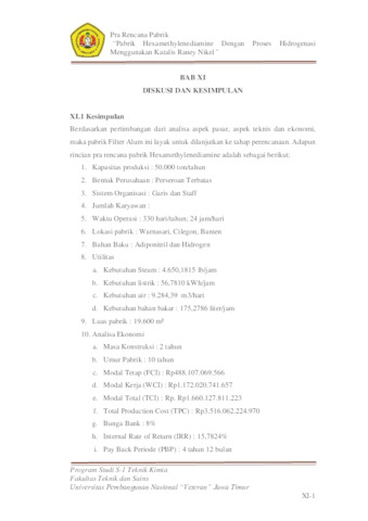 Pabrik ini dirancang untuk memproduksi Hexamethylenediamine dengan kapasitas 50.000 ton per tahun menggunakan metode hidrogenasi tekanan rendah. Pabrik akan dibangun di Kelurahan Rawaarum, Kota Cilegon, Jawa Barat. Pabrik ini direncanakan beroperasi secara kontinyu selama 24 jam dalam 330 hari dalam setahun dengan bahan baku utama yaitu Adiponitril yang didapatkan dari PT. Shandong Ruihai, Gas Hidrogen dan NaOH dari PT. Sulfindo, serta Katalis Raney Nikel dari PT Shanghai Richem. Reaksi hidrogenasi berlangsung dalam reaktor bubble column pada suhu 75 °C dan tekanan 30 atm, bersifat eksotermis. Reaksi yang terjadi menghasilkan Hexamethylenediamine. Produk yang keluar dari reaktor kemudian dimurnikan hingga mencapai kemurnian 99,2%. Kebutuhan energi pabrik diperoleh dari PLN dan generator, sedangkan pendinginan menggunakan air pendingin dari sumber terdekat. Limbah proses akan diolah di unit pengolahan limbah (WWTP). Pabrik ini menggunakan sistem organisasi berbentuk perseroan terbatas (PT) dengan struktur organisasi garis dan staf. Dari hasil perhitungan dan pembahasan yang telah dilakukan dapat disimpulkan beberapa hal sebagai berikut: 1. Kapasitas Produksi : 50.000 ton/ tahun 2. Bentuk Organisasi : Perseroan Terbatas (PT) 3. Sistem Organisasi : Garis dan Staf 4. Lokasi Pabrik : Rawaarum, Cilegon, Banten 5. Luas Tanah : 19.600 m2 6. Sistem Operasi : Kontinyu 7. Jumlah Karyawan : 157 orang 8. Bahan Baku : Adiponitril dan Gas Hidrogen 9. Kebutuhan Utilitas a. Steam : 4.650,1815 lb/jam b. Bahan Bakar : 175,2786 liter / jam c. Air : 9.284,39 m3 / hari d. Listrik : 56,7810 KWh 10. Analisa ekonomi a. Masa Konstruksi : 2 tahun b. Umur Pabrik : 10 tahun c. Modal Tetap (FCI) : Rp488.107.069.566 d. Modal Kerja (WCI) : Rp1.172.020.741.657 e. Modal Total (TCI) : Rp. Rp1.660.127.811.223 f. Total Production Cost (TPC) : Rp3.516.062.224.970 g. Bunga Bank : 8% h. Internal Rate of Return (IRR) : 15,7824% i. Pay Back Periode (PBP) : 4 tahun 12 bulan j. Break Event Point (BEP) : 33,20%