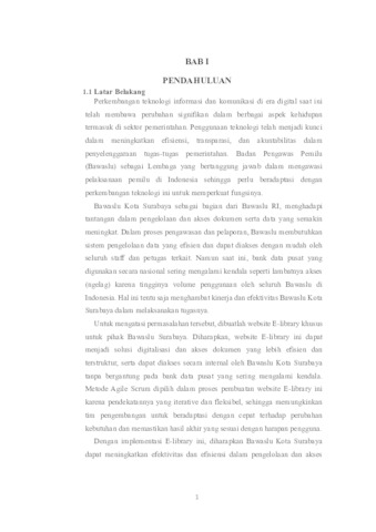 Perkembangan teknologi informasi dan komunikasi di era digital telah membawa perubahan signifikan dalam berbagai aspek kehidupan, termasuk sektor pemerintahan. Badan Pengawas Pemilu (Bawaslu) Kota Surabaya menghadapi tantangan dalam pengelolaan dan akses dokumen yang efisien dan cepat. Dalam upaya mengatasi masalah tersebut, penelitian ini bertujuan untuk merancang dan membangun sebuah website E-Library yang khusus diperuntukkan bagi Bawaslu Kota Surabaya. E-Library ini diharapkan dapat menjadi solusi digitalisasi dan akses dokumen yang lebih terstruktur dan efisien, mengurangi ketergantungan pada bank data pusat yang sering mengalami kendala akses. Metode Agile Scrum dipilih untuk mengembangkan E-Library ini karena pendekatannya yang iterative dan fleksibel, memungkinkan tim pengembangan untuk beradaptasi dengan cepat terhadap perubahan kebutuhan. Proses pengembangan meliputi analisis kebutuhan, desain sistem, implementasi, pengujian, dan deployment. Hasil dari implementasi E-Library ini menunjukkan peningkatan efektivitas dan efisiensi dalam pengelolaan dokumen serta memperkuat fungsi pengawasan dan pelaporan Bawaslu Kota Surabaya. Dengan adanya E-Library ini, diharapkan Bawaslu Kota Surabaya dapat menjalankan tugasnya dengan lebih produktif dan responsif, serta meningkatkan transparansi dan akuntabilitas dalam pengelolaan dokumen. Kata Kunci: E-Library, Agile Scrum, Bawaslu, Digitalisasi Dokumen, Akses Dokumen