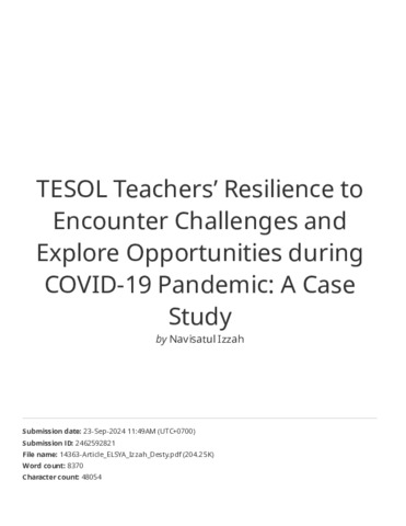 Izzah, Navisatul (2023) Uji Turnitin TESOL Teachers’ Resilience to Encounter Challenges and Explore Opportunities during COVID-19 Pandemic: A Case Study. Universitas Pembangunan Nasional Veteran Jawa Timur.