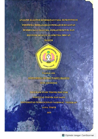 Riamto, Mohammad Shodiq Wahyu (2025) ANALISIS KLASTER KEMISKINAN PADA 38 PROVINSI DI INDONESIA BERDASARKAN PENGARUH KUALITAS SUMBER DAYA MANUSIA, INFRASTRUKTUR, DAN EKONOMI DENGAN ALGORITMA DBSCAN. Undergraduate thesis, UPN Veteran Jawa Timur.