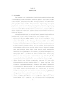 Penelitian ini membahas optimasi Algoritma K-Nearest Neighbor (KNN) menggunakan Algoritma Genetika (GA) dalam mendeteksi penyakit diabetes mellitus. Penelitian mencakup tahapan pengumpulan dataset gejala penyakit diabetes mellitus, preprocessing data melalui normalisasi dan penyelarasan dataset, implementasi model, serta pengujian dengan berbagai skenario untuk mendapatkan akurasi tertinggi. Data yang digunakan adalah data Pima Indians Diabetes Database sebagai dataset 1 dan data Early Stage Diabetes Risk Prediction Dataset sebagai dataset 2. Evaluasi dilakukan dengan membandingkan hasil akurasi antara KNN tanpa optimasi dan KNN yang telah dioptimasi menggunakan Algoritma Genetika. Hasil penelitian menunjukkan bahwa optimasi dilakukan dengan mencari kombinasi optimal dari nilai k dan fitur-fitur yang digunakan dalam klasifikasi. Algoritma Genetika menghasilkan individu dengan fitness terbaik berdasarkan kombinasi nilai k dan fitur yang mampu memberikan akurasi tertinggi. Pengujian dilakukan pada dua dataset dengan dua nilai fold yang berbeda. Hasil akurasi terbaik didapat pada pengujian fold 10, dengan akurasi pada dataset 1 dari 74.2% menjadi 79.1% setelah dioptimasi. Sedangkan pada dataset 2, akurasi yang didapat adalah 97.5% menjadi 98.2% setelah dioptimasi. Terdapat peningkatan akurasi pada dataset 1, sedangkan pada dataset 2, tidak terjadi peningkatan akurasi yang signifikan. Kesimpulan dari penelitian ini adalah bahwa optimasi Algoritma KNN menggunakan Algoritma Genetika terbukti meningkatkan akurasi deteksi diabetes mellitus, terutama pada dataset numerik dengan fitur yang lebih kompleks.
