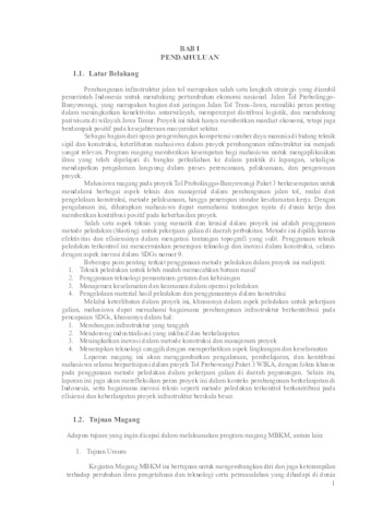 This internship report discusses the experience and outcomes of the MBKM internship program conducted on the Probolinggo–Banyuwangi Toll Road Construction Project Package 3, managed by PT Wijaya Karya (Persero) Tbk. The internship aimed to provide students with practical understanding of toll road construction project management, covering aspects such as administration, project organization, heavy equipment management, and on-site construction techniques. The report reviews the project’s organizational structure, contract administration, heavy equipment productivity calculations, as well as the implementation of legal, labor, and occupational health and safety (OHS) aspects in the field. It also covers ground improvement technologies, environmental management techniques, foundation construction methods, and the construction of long-span bridge structures. Through this internship, students gained direct experience in managing large-scale infrastructure projects, understood both technical and non-technical challenges on-site, and were able to comprehensively apply civil engineering knowledge in real-world professional settings. This report is expected to serve as a reference and learning resource for students and relevant stakeholders in the implementation of toll road construction projects in Indonesia.