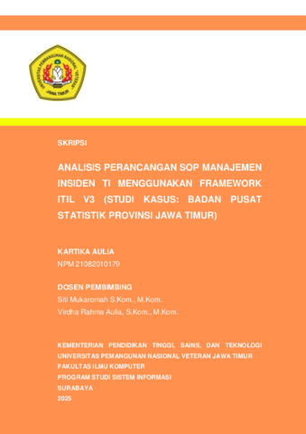 Aulia, Kartika (2025) Analisis Perancangan SOP Manajemen Insiden TI Menggunakan Framework ITIL V3 (Studi Kasus: Badan Pusat Statistik Provinsi Jawa Timur). Undergraduate thesis, Universitas Pembangunan Nasional "Veteran" Jawa Timur.
